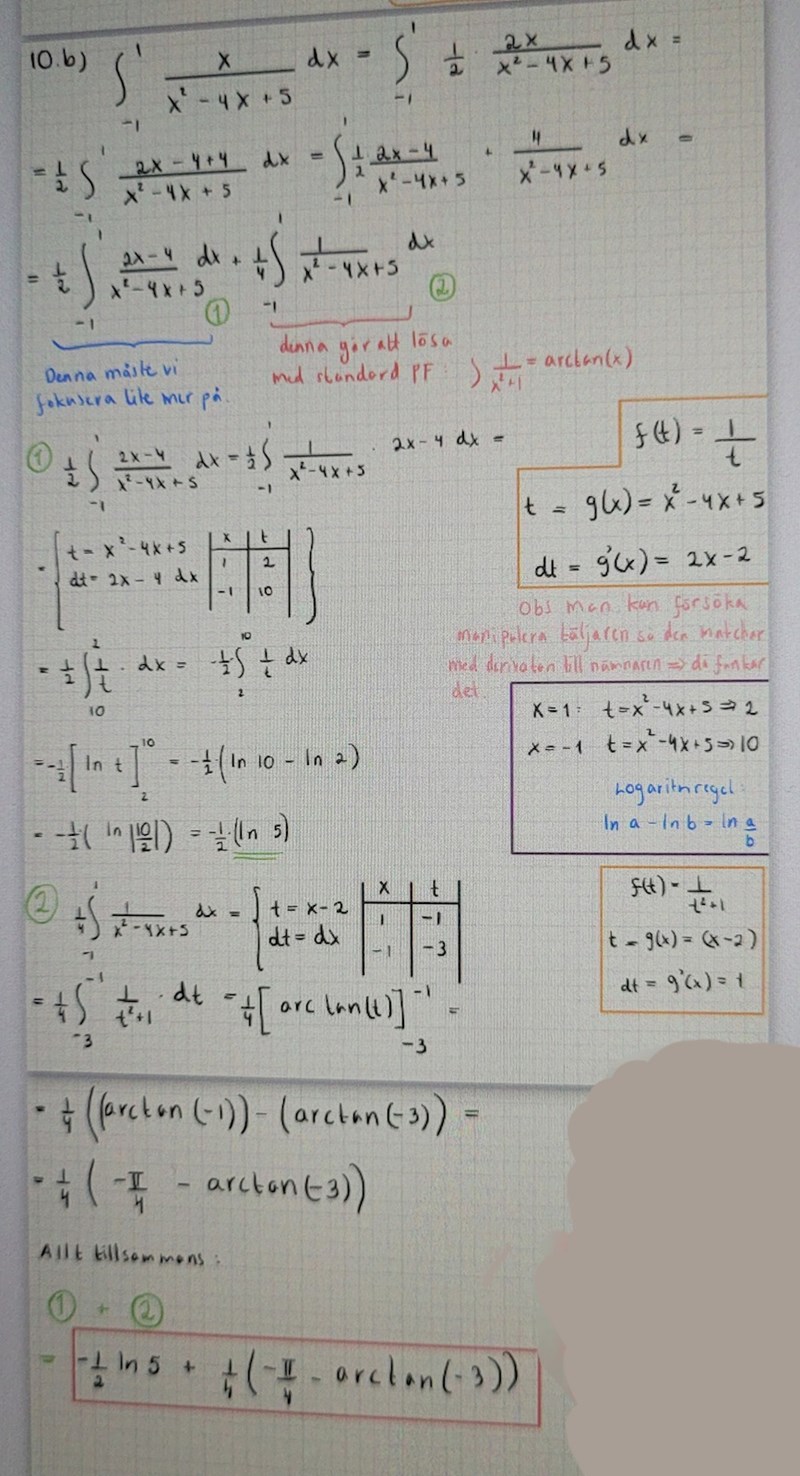 Varför kan jag inte bryta ut 1/4? Jag ville få en etta i täljaren eller tänker jag fel? Går det inte att dela upp integralen i två delar då jag insåg att jag har 2 olika rationella uttryck?