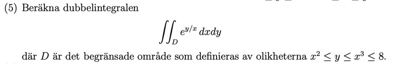 x=12y=x2x3ey/xdydx\displaystyle \int_{x=1}^{2}\int_{y=x^2}^{x^3}\,e^{y/x}\,\mathrm{d}y\mathrm{d}x
