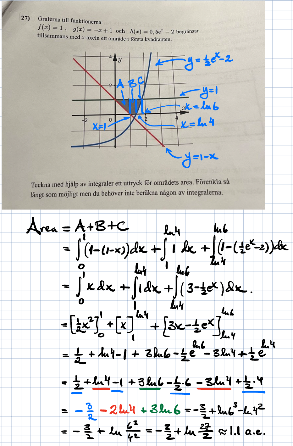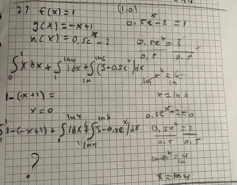 aaaa förstod att man ska ta och dela upp det är det liksom det man alltid ska tänka då vid integral med flera funktioner? Liksom försöka få arean av olika delar som du gjorde nu