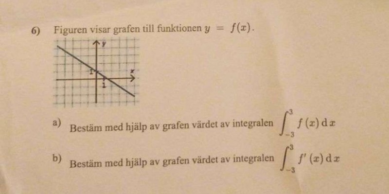 Integralen motsvarar arean mellan funktionen och x-axeln. Kan du se vad det blir mellan -3 och 3?