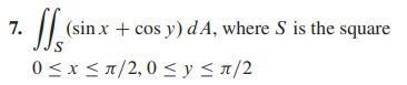 Okej, dA= dxdy. Jag är med på det. Men ska jag inte sin(x) och cos(y) med avseende på t.ex y först sen stoppar jag in värdena för intervallet y och svaret ska jag integrera med avseende på andra x och slutligen stoppar jag in värdena??