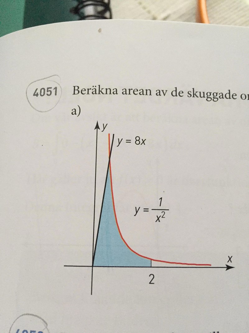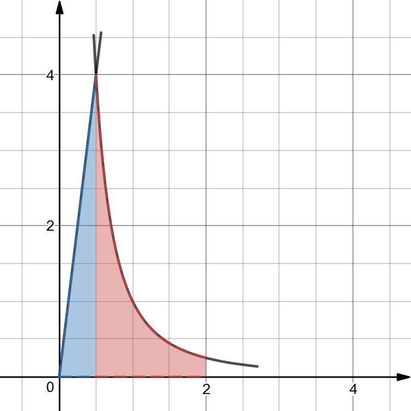 Har börjat med att skriva primitiva funktionen för båda dom, dvs. 4x^2 och -1/x. Kan läsa av i grafen att ena integrationsgränsen är 2. Bland ledtrådar och lösningar på den här uppgiften står det att den andra integrationsgränsen blir 0.5, hur har man tänkt då? Jag skulle ha skrivit 0 som den andra integrationspunkten.