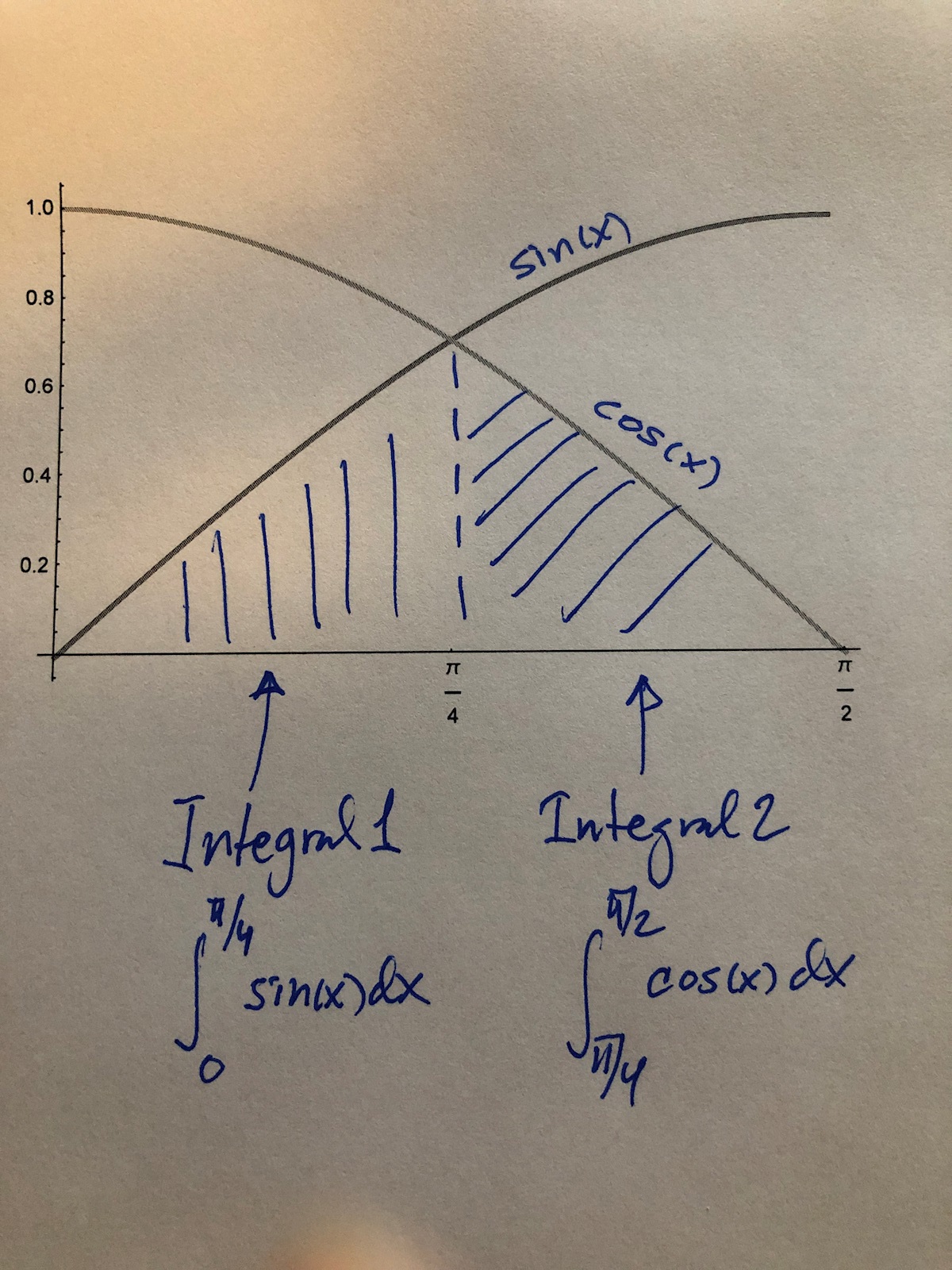 INT_0^pi/4 sin(x) dx + INT_pi/4^pi/2 cos(x) dx.