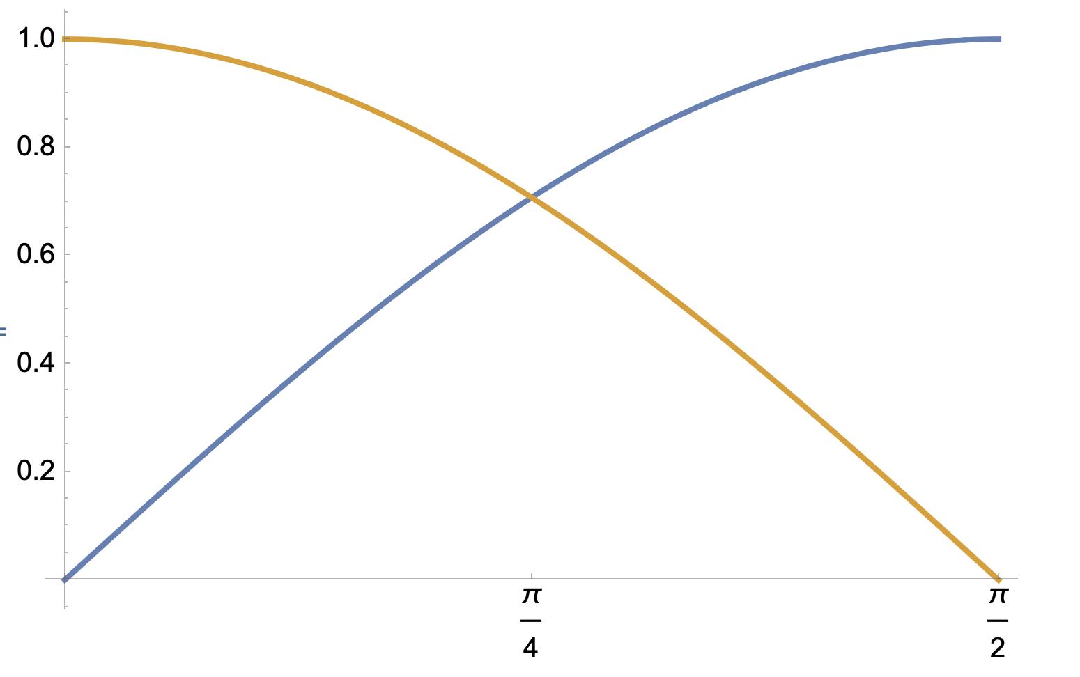 sin(x)=cos(x) har lösningen x=45°=π/4.