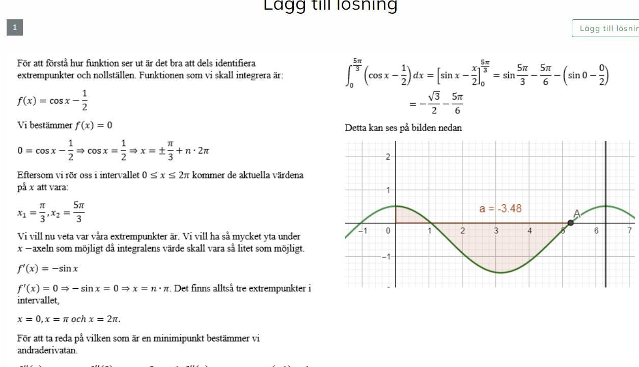 Ang den här uppgiften. Varför är det inte exakt avståndet pi mellan nollställena dvs x= pi/3 och 5pi/3. Borde man inte få fram det andra nollstället genom att ta pi/3+3pi/3?! Men då får man 4pi/3. Vad gör jag för fel?