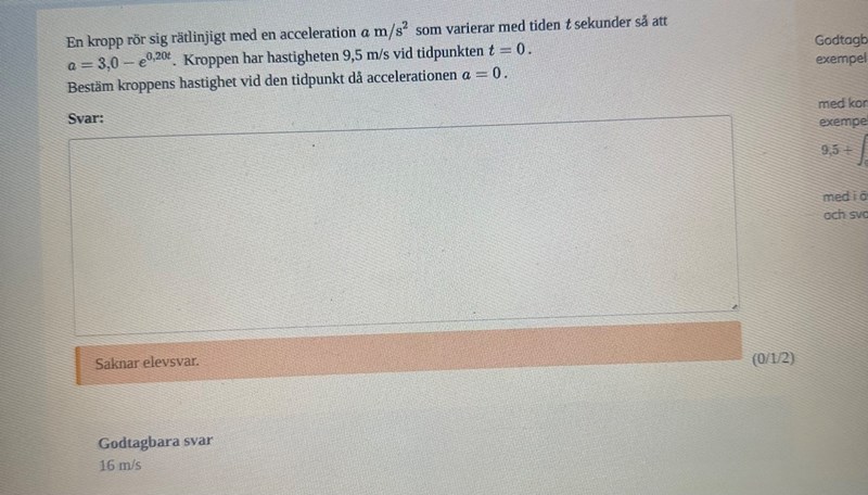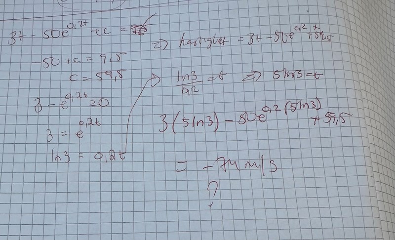Det ska stå 5 och inte 50. Sen behöver du dessutom inkludera själva integrationen och visa hur du kommer fram till den primitiva funktionen. Annars är själva uträkningen rätt.