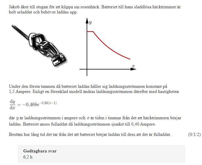 Jag beräknar de primitiva funktionerna av y'(x), dvs y(x)=1.3e-0.36(x-1)+C. Då har jag laddningsströmmen som funktion av tiden, precis det som grafen visar. Förutom konstanten C, men eftersom jag vet att y(1)=1.5 så kan jag beräkna konstanten. Sedan kan jag beräkna tiden för vilken y=0.4.