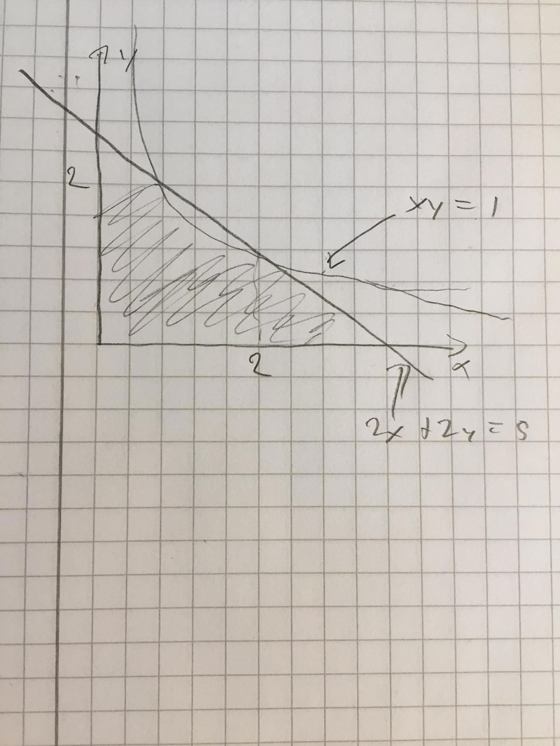 när man sedan ska räkna ut gränsvärdena vet vi att linjen 2x+2y=5 och hyperbeln xy=1 skär varandra i punkterna (x=2, y=0.5) och (x=0.5, y=2)