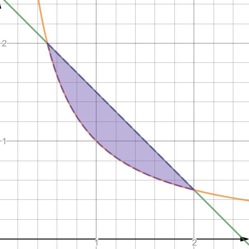 Linjen och kurvan skär varandra i två punkter i det aktuella området, nämligen (2, 0.5) och (0.5, 2).