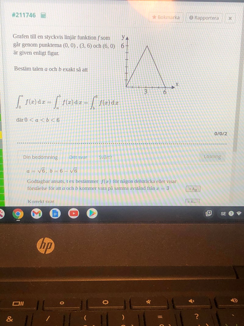 Det låter vettigt? Om du gör samma sak med integralen mellan b och 6, vad får du? Har du bestämt funktionen mellan och korrekt? :)