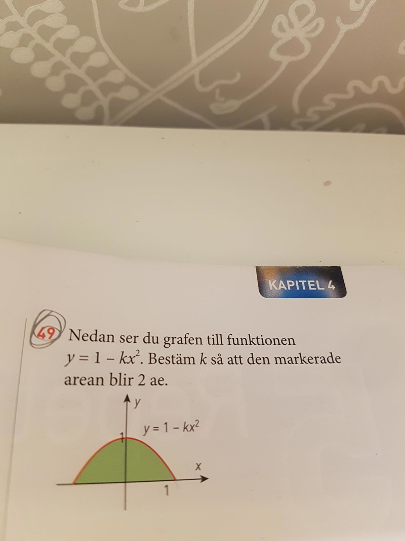 Citerar från gamla pluggakuten och användaren Ikos: "/.../Beräkna arean under kurvan (om denna är den markerade arean i den fullständiga uppgiften) y=1-kx^2, sätt den lika med 2 och lös för k."
