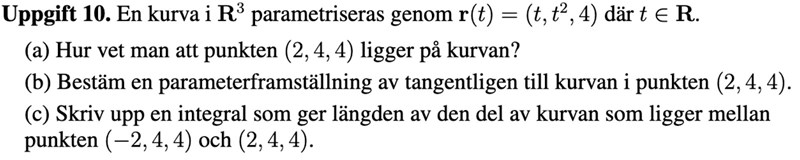 t1 är det parametervärde som motsvarar punkten (-2, 4, 4) och t2 det parametervärde som motsvarar punkten (2, 4, 4).