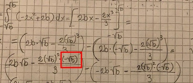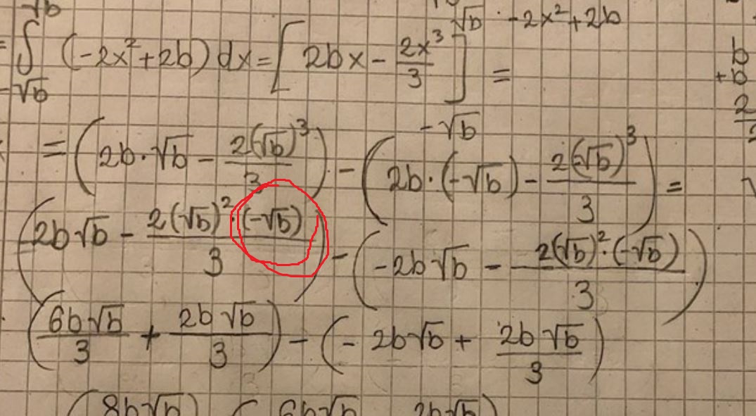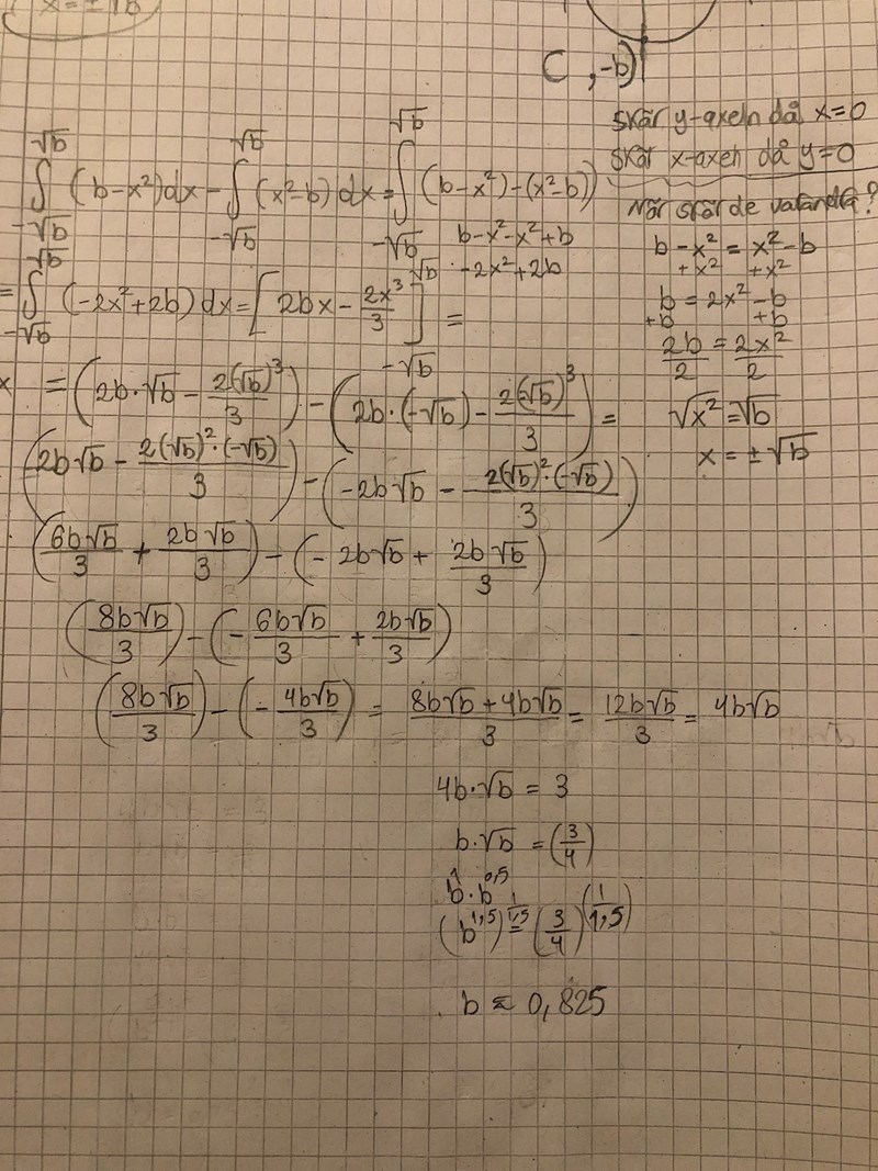 Pga av symmetri kan du nöja dig med att integrera från 0 till sqrt(b) och dubbla reslutatet, vilket ger lite enklare algebra.