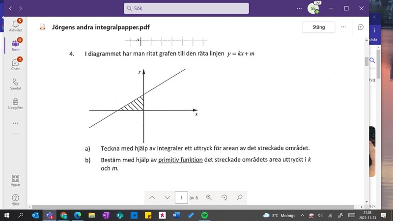 a) integralen av kx+m i intervallet 0 > x > -m/k