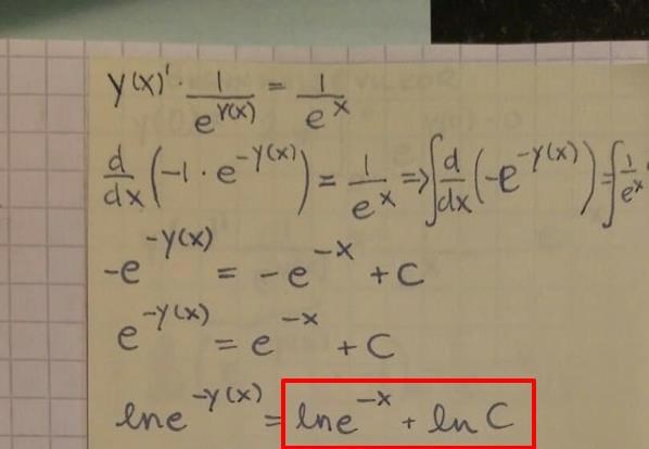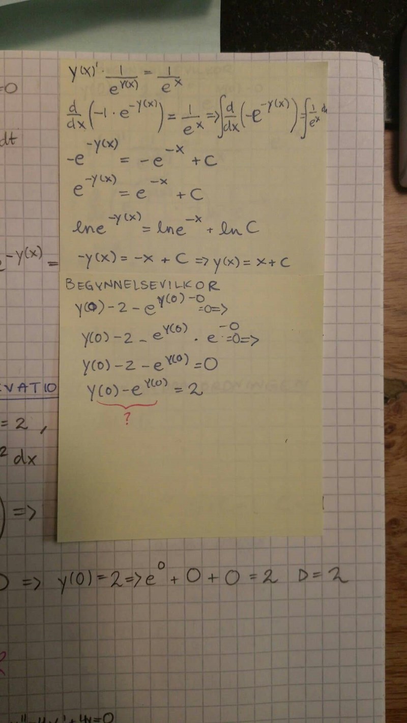 därför känns det misstänksamt att 1) jag får min allmänna lösning till bara y=x+c och att 2) mitt begynnelsevilkor börja likna nåt konstigt. Jag vet heller inte riktigt hur jag ska göra med y(0)-e^y(0)