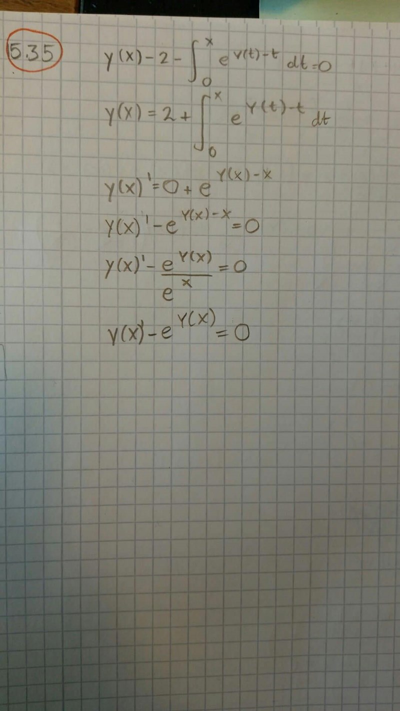 Jag glömde bort att om jag ska förkorta bort 1/e^x från leden så måste jag ju också göra det från y(x)'-termen. Tack så mycket, jag ska försöka lösa den ekvation jag fått fram nu :D