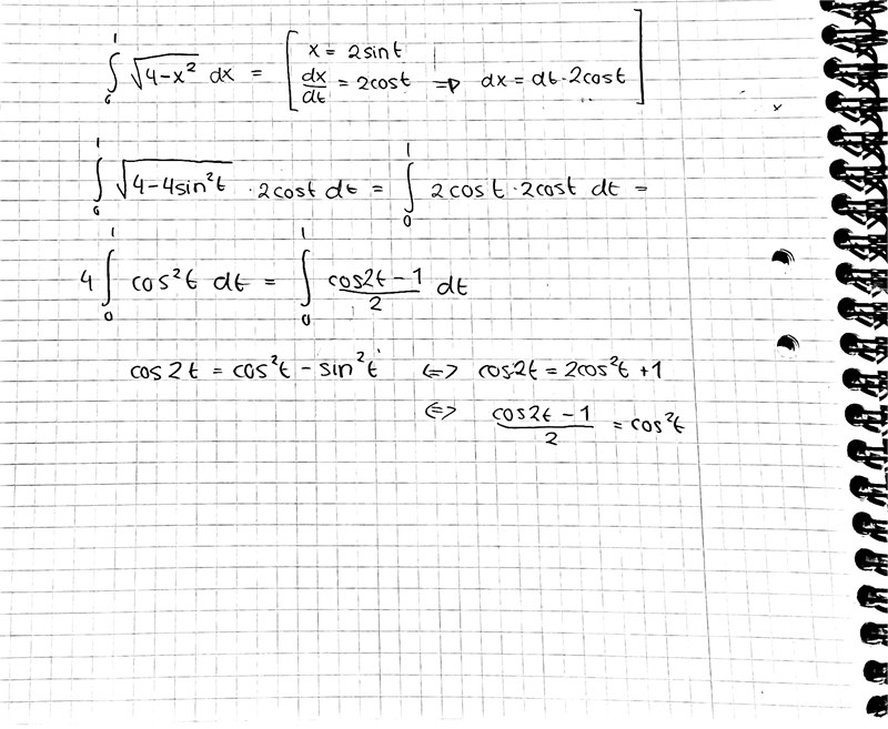 x = 2sint är naturligt när man väl har sett det (trigonometriska ettan gör att roten försvinner och sedan är det bara trigonometri kvar), men man kan nog inte begära att någon ska komma på det själv.
