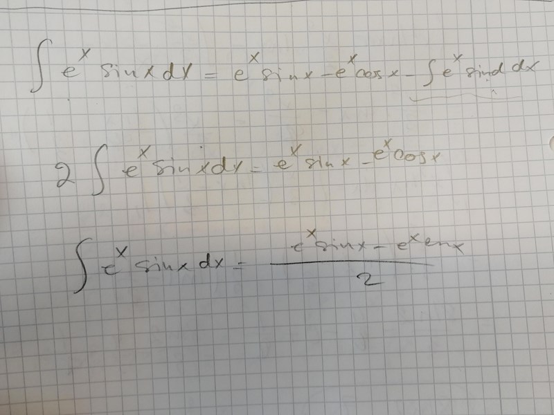 Ja, partialintegration är en bra idé, men det är inte uppenbart varför! Prova ändå att utföra den två gånger, där du låter f(x)f(x) vara exponentialfunktionen så det är den trigonometriska du deriverar. Se om du kan hitta (det mycket tjusiga) knepet sen.