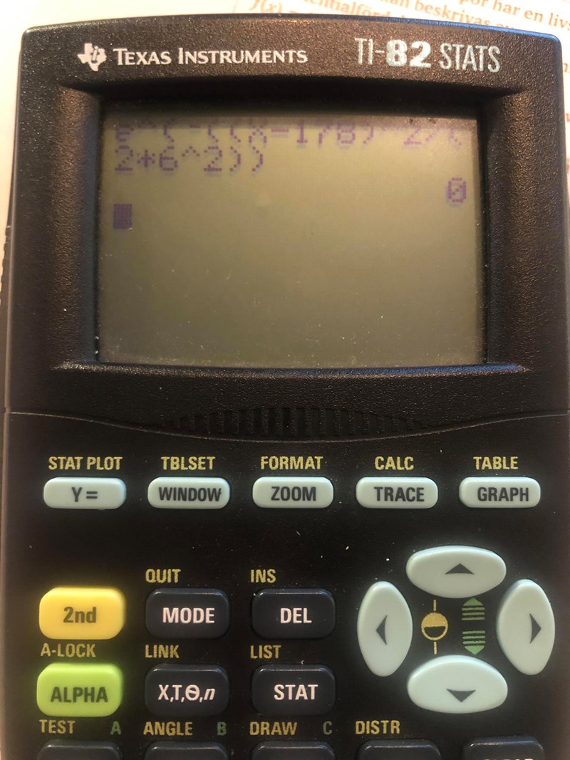 när jag räknar ut funktionen separat blir allt 0 eftersom e^-((x-178)^2/(26^2)) = 0. Får ni också det svaret eller matar jag in de fel i räknaren?