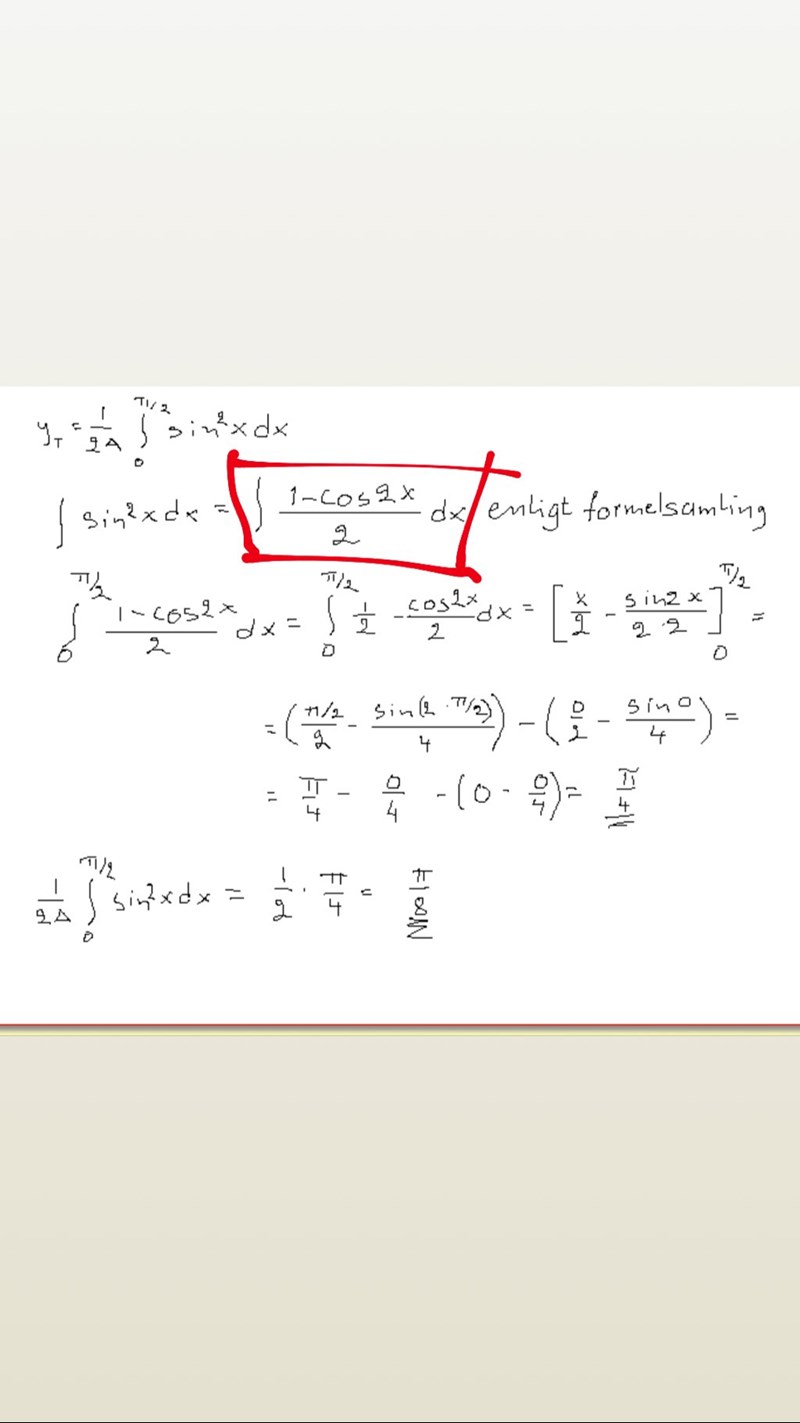 Hur får han (sin x)^2= (1-cos2x)/2 ? Jag trodde att Cos(2x) och (Cosx)^2 inte va samma sak? För isåfall borde han väll få enligt trigettan 1-(cosx)^2 ? Eller hur gjorde han?