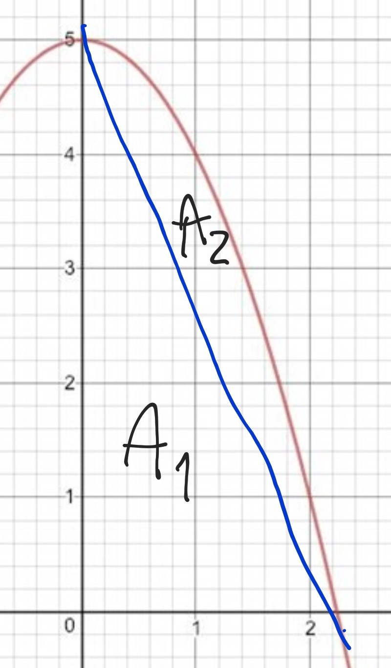Här är ju själva grafen. Jag skulle rita en linje mellan kurvans skärningspunkt med y-axeln och dess skärningspunkt med x-axeln. Då bildas det en triangel, A1.