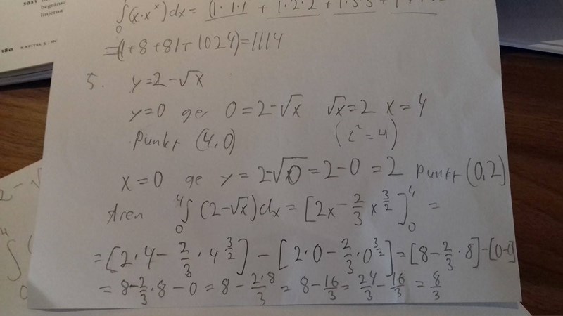 Jag antar att utifrån hans uträkning att koordinataxlarna är (4,0) och (0,2) och att arean är 8/3 ???