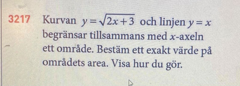 Tack så mycket:), jaa det ser jag ska man ta då integralen av den övre kurvan som är roten ur 2x+3 - linjen y= x ? nu ser jag varför jag får fel värde på skärningspukterna när jag sätter kurvorna = varandra, det är för att de enbart skär varandra på ett ställe, stämmer det?