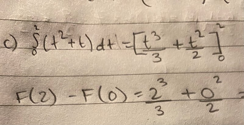F(x)=t^3/3+t^2/2, det du ska beräkna är F(2)-F(0). F(0)=0 så du har ju bara F(2)-0=F(2). Kan du nu beräkna F(2)?