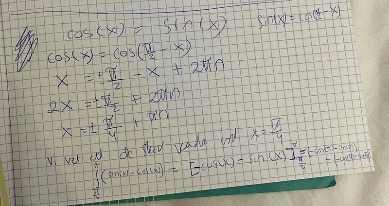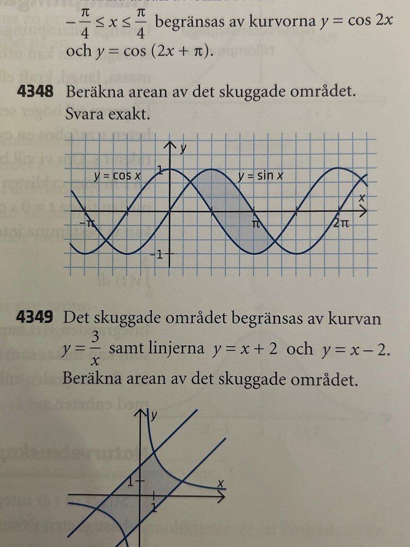 hur hittar jag integrationsgränsen? Jag fick att ena integrationsgränsen är vid x=pi/4 och x=5pi/4 .. Men svaret blir ju ändå fel