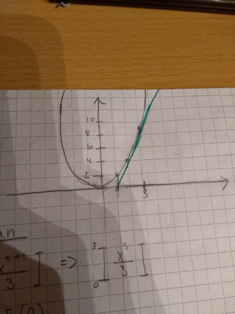 Jag tänker att det är området som är mellan det gröna och kurvan som är tangentens area, alltså är kurvan överfunktionen och tangenten är underfunktionen.