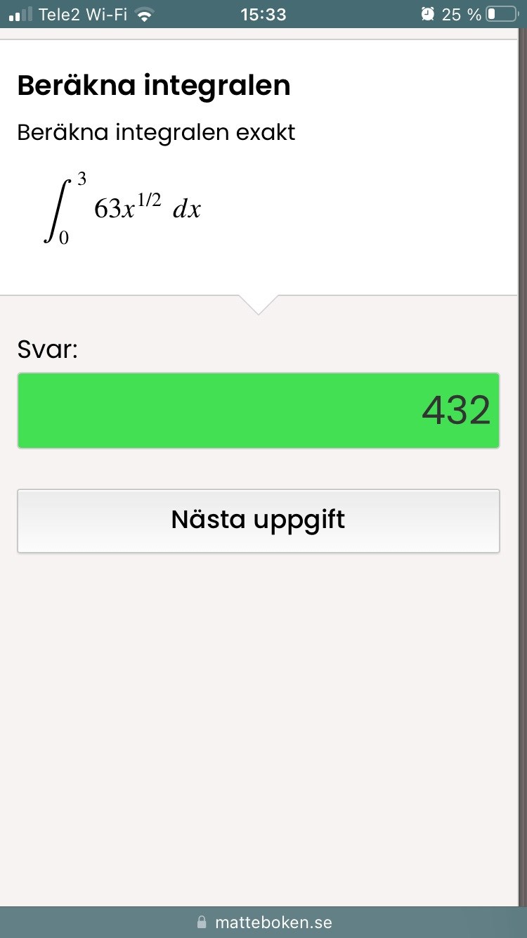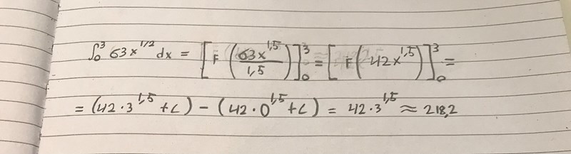 I uppgiften ombes man att beräkna svaret exakt med när jag sätter in 3 i funktionen blir svaret ett decimal tal (ungefär 218,2 vilket också skiljer sig från det korrekta svaret 432). Detta får mig att tro att jag har gjort något fel och att det finns ett bättre sätt att lösa uppgiften.