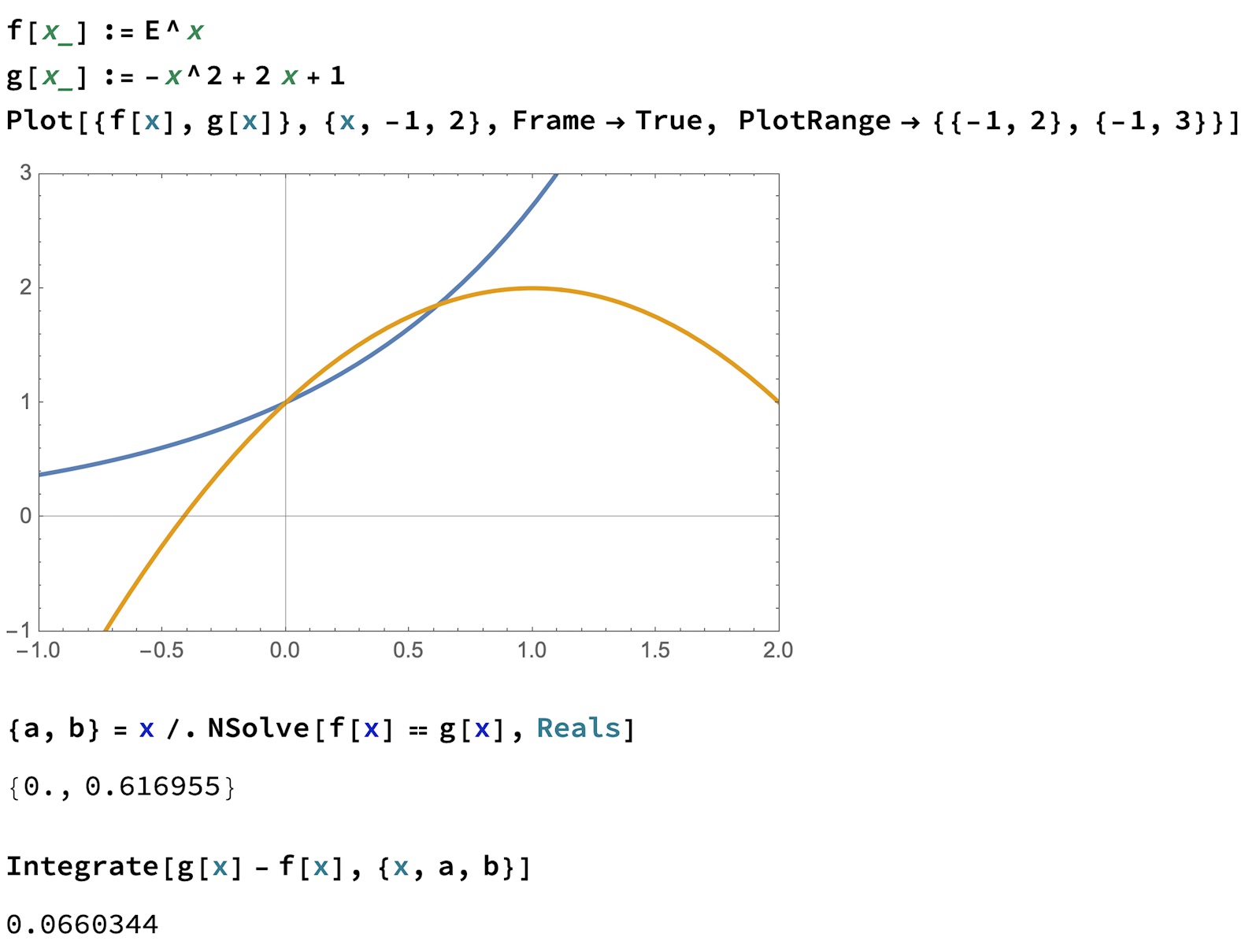 är en sådan ekvation. Här vill de att du använder räknaren för att beräkna skärningspunkten och sedan troligen inbyggda funktioner för att beräkna integralen.