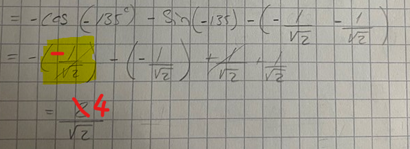 Hur är cos (-135)= cos(135). Kan du visa vilken rad jag har gjort fel