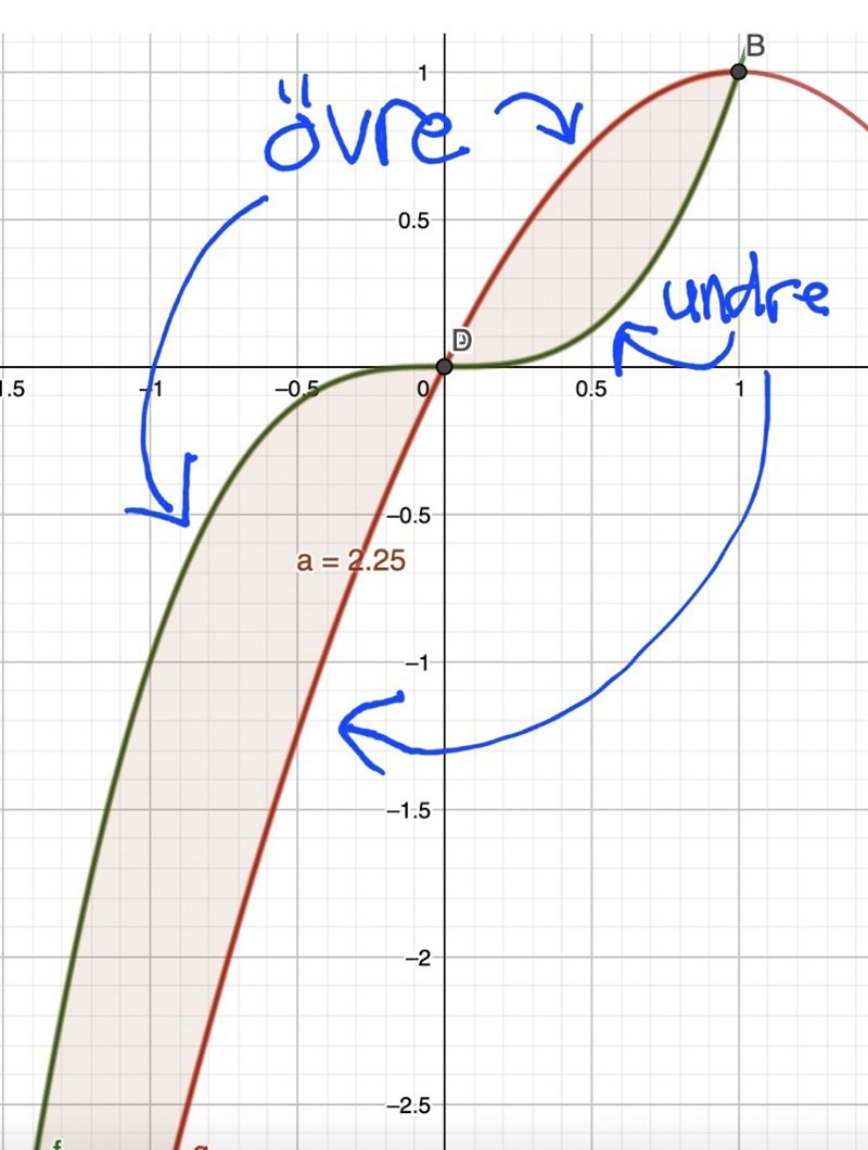 Man behöver ta reda på vilken funktion som är över- respektive underfunktion i båda intervallen. Hur ser det ut?