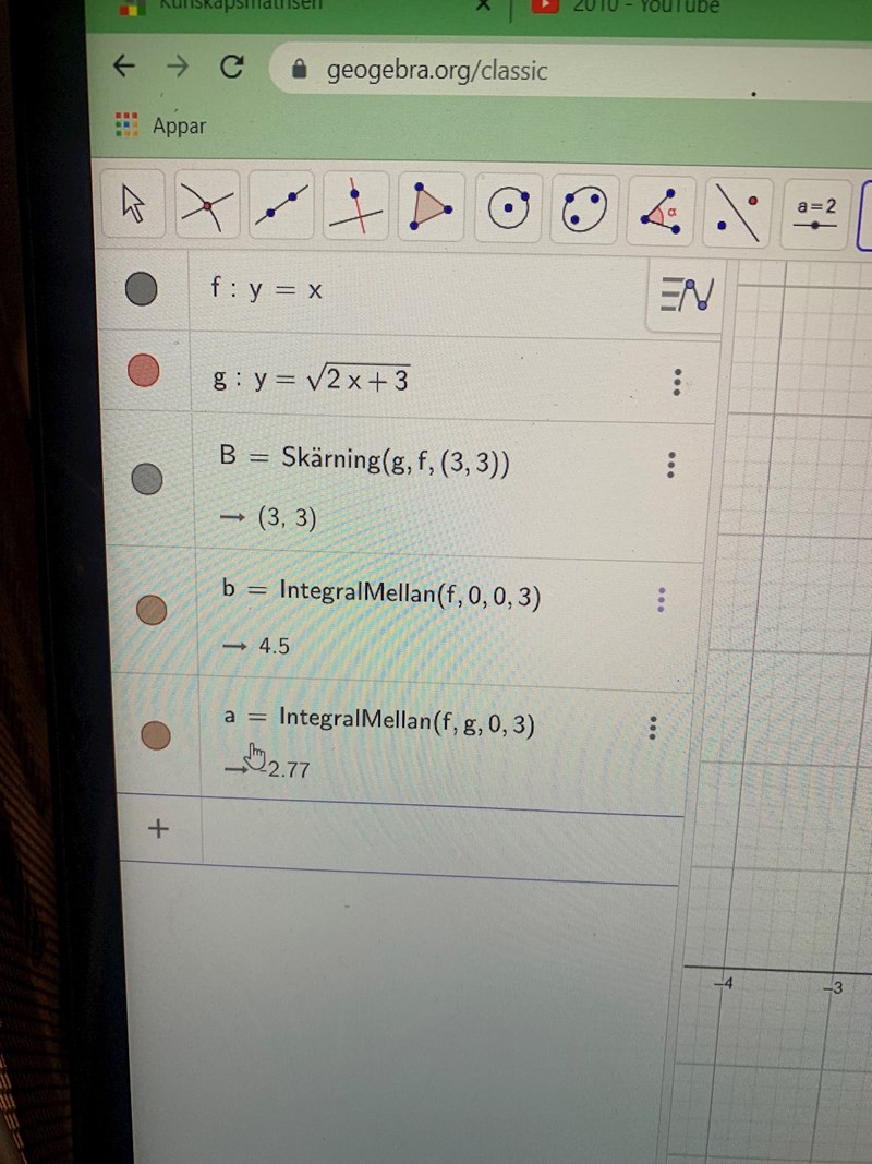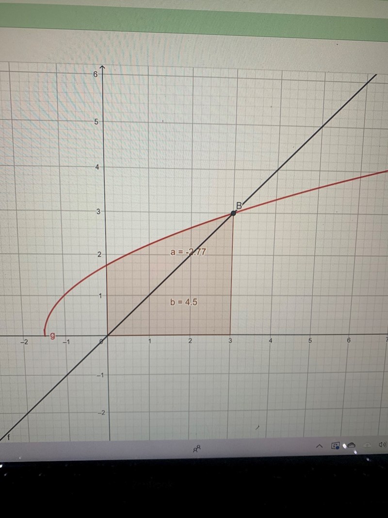 borde det inte vara a=Inegral mellan(g,f,0,3)?