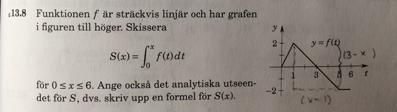Hej! Har fastnat på en rätt enkel uppgift där man ska ange en formel för S(x) enligt figuren nedan. Jag har bestämt ett uttryck för varje delintervall, men det andra intervallet, , blir fel och jag vet inte varför.