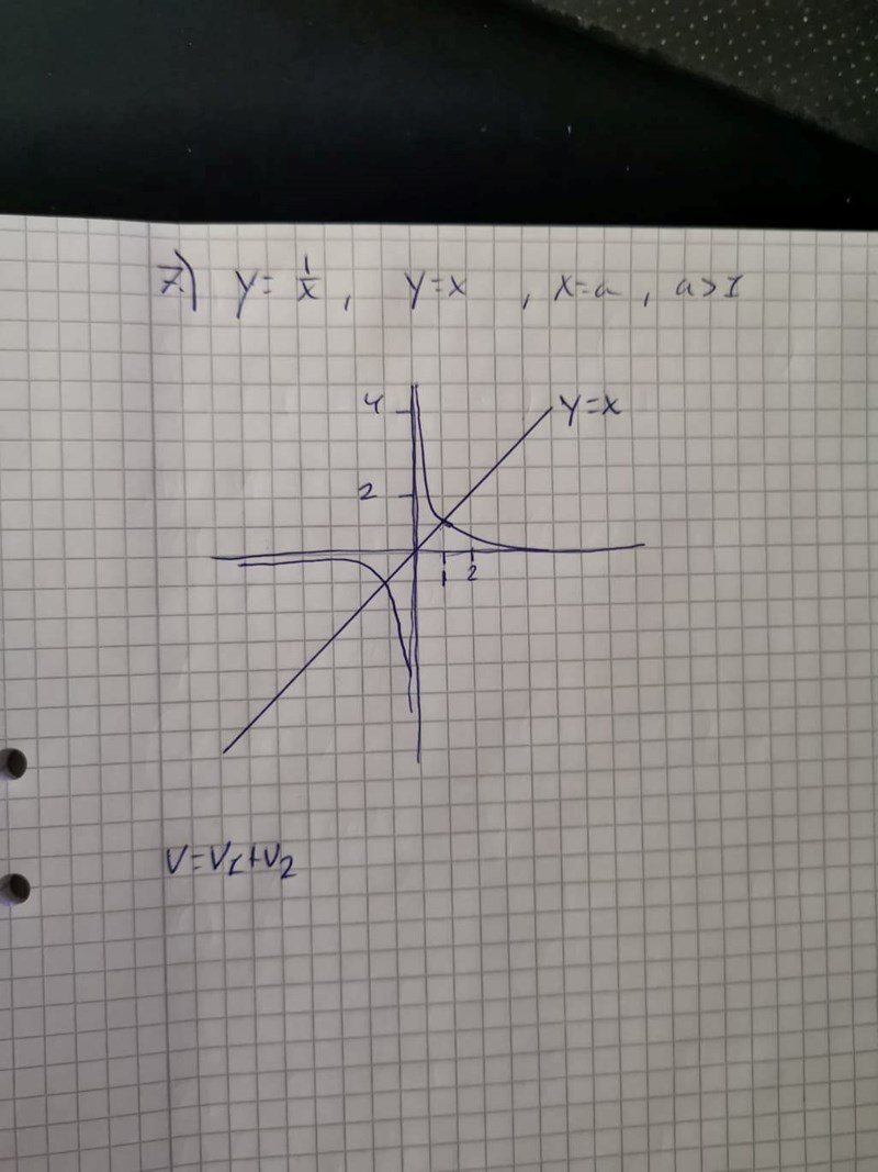 V1 kommer ju ha gränserna 0 till skärningspunkten av y=1x och y=x. Vkommer gränser från skärningspunkten till x=a.