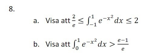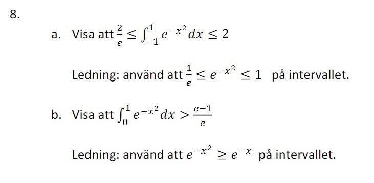 Smaragdalena skrev:Du kan väl räkna ut för x = 0, 1 och -1, rita upp funktionen mycket ungefärligt, rita upp de båda rektanglarna med höjden 1/e respektive 1 och jämföra areorna. Du borde kunna visa att värdet för ligger innanför de gränserna i hela intervallet, och då är du nästan framme.