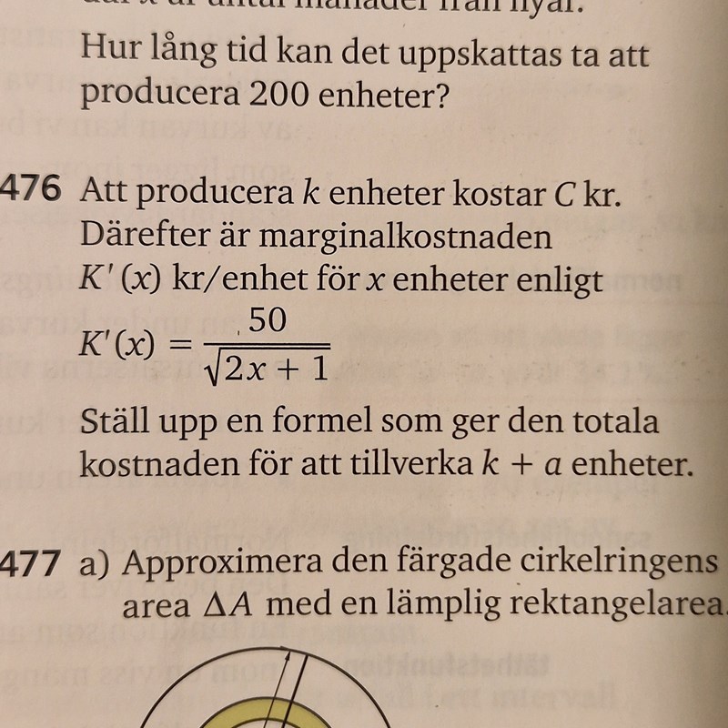Till den nedanstående uppgiften förstår jag inte lösningen. Jag tänker att K(x) beskriver kostnaden för att producera x enheter. Då borde kostnaden för att producera k + a enheter bli C + K(A), och inte C - K(0) + K(A).