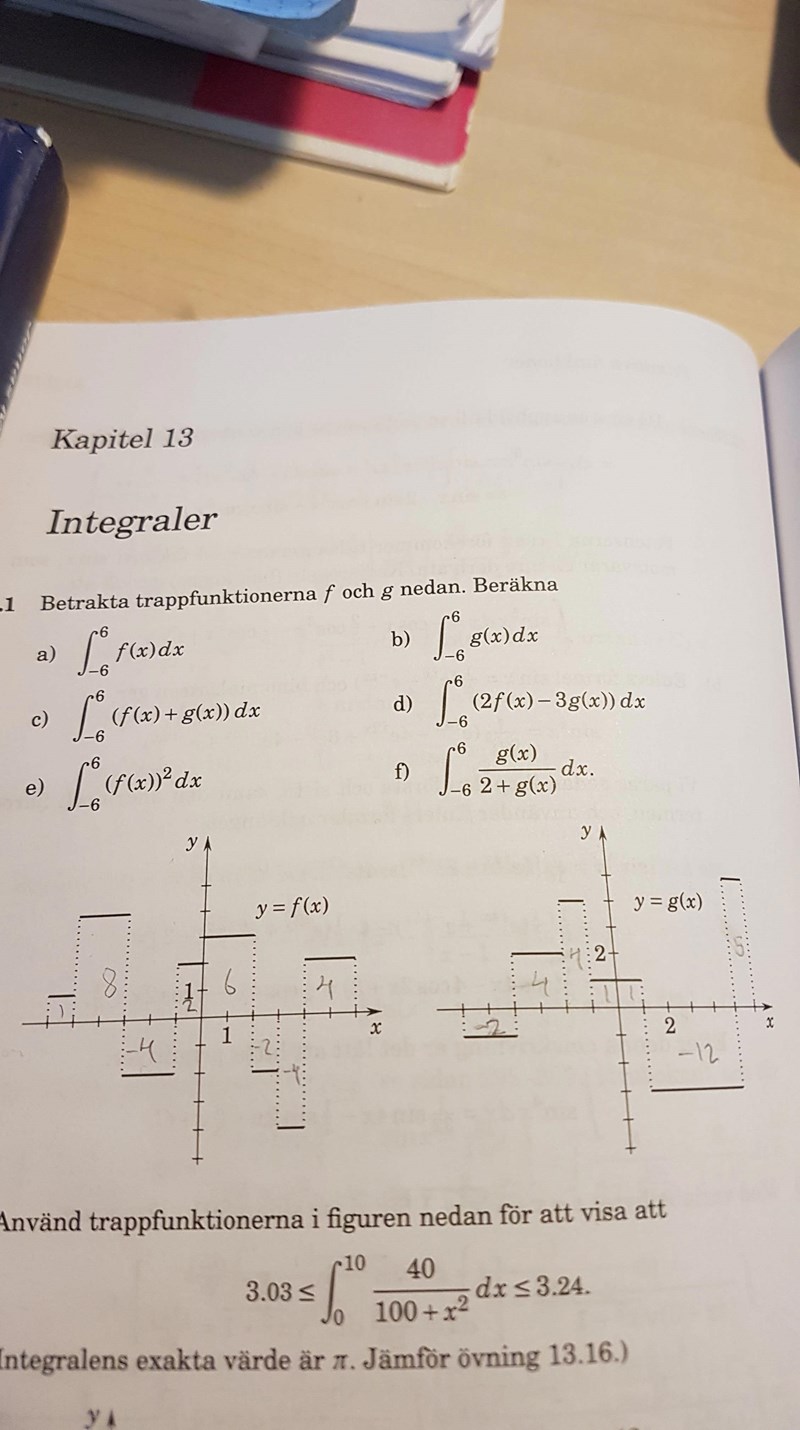 Smaragdalena skrev :Dela in intervallet i 8 integraler, en för varje delrektangel. Läs av f(x) för varje del-integral, kvadrera den och multiplicera med bredden (eller integrera den konstanta funktionen, om du tycker det är roligare). Addera de 8 integralerna.