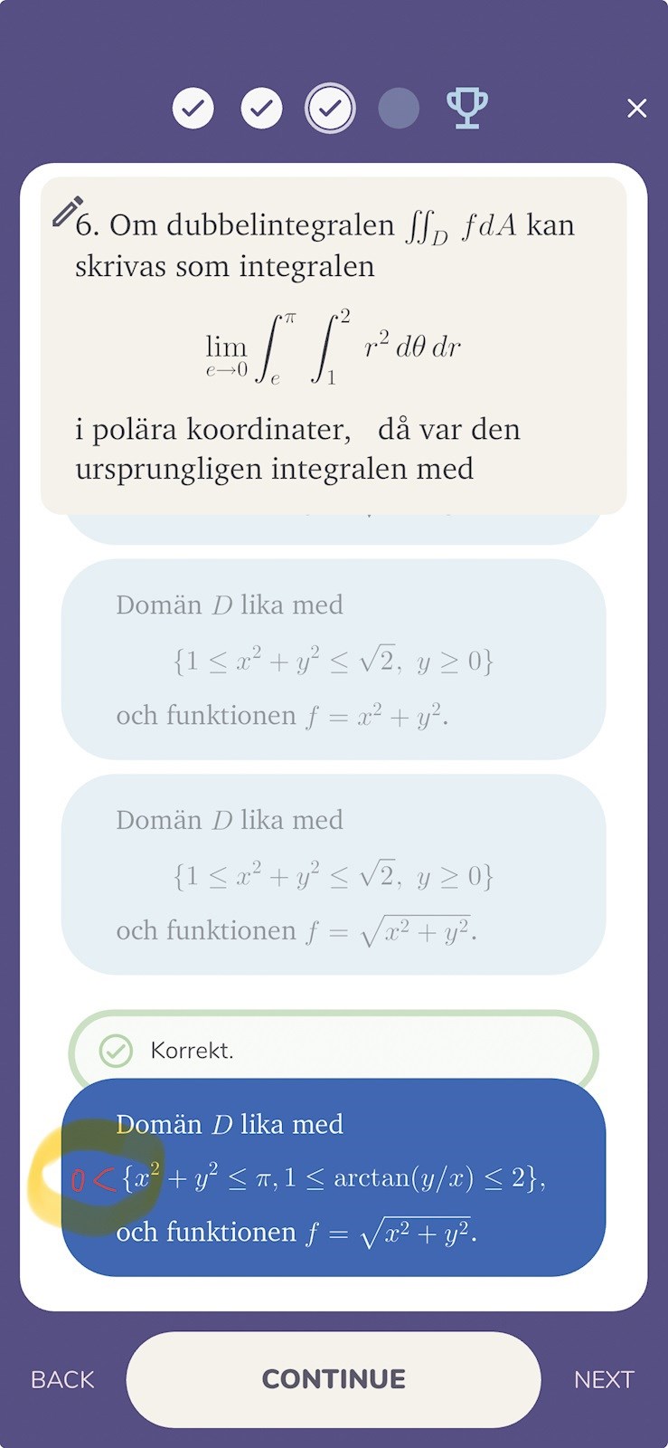 Hej! På nedanstående uppgift, varför står inte 0< till höger om uttrycket för området D? (Det som jag lagt till i rött) Jag tänkte att eftersom de har uttryckt dubbelintegralen med ett gränsvärde kanske det betyder att det aldrig blir noll och därmed att det ska vara en strikt olikhet?