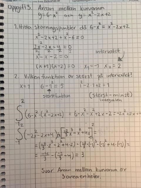Uppgiften lyder. Beräkna arean av det område som begränsas av kurvorna y = 6 - x2 och y = x2 - 2x + 2. Gör jag rätt nedan?