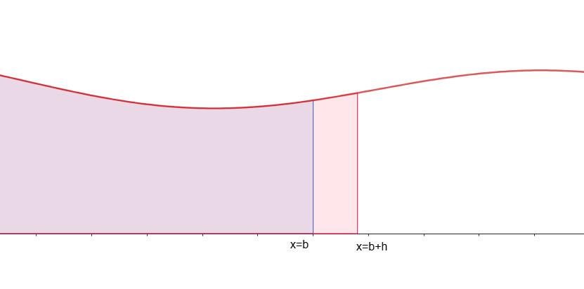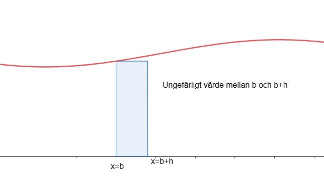 Tänk nu att vi vill hitta arean mellan någon annan punkt lite längre bort från . Denna punkt är distansen bort och har alltså x-värdet . Eftersom ger arean från 0 till och ger arean från 0 till b så kommer ge arean från till .Samtidigt kan vi få ett ungefärligt värde på arean mellan och genom att använda en rektangel. Distansen mellan och är så klart . Samtidigt är höjden