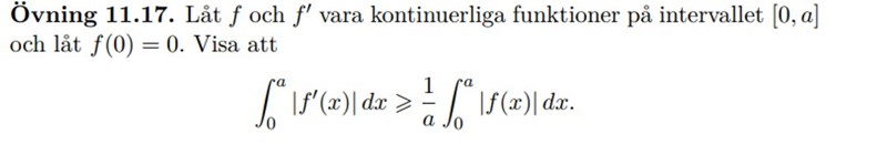 Vet ej på vilken kurs denna uppgift ges och det finns nog ngt trolleritrick som gör susen. I brist på detta kan man tillämpa Weierstrass approximationsats på rummet M bestående av f tillhörande C1([0,a]) sådana att f(0)=0 och underrummet av polynom på kompakta [0,a]. Påståendet är nämligen trivialt för f=0 och lätt att visa för f=xn , n>=1. Alltså gäller det för alla polynom och dessa är täta i M enligt Weierstrass.