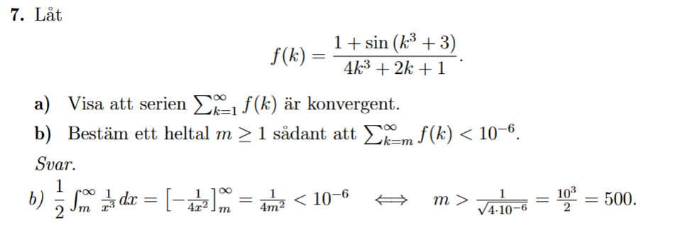 Anto: Du har märkt en liten detalj som faktiskt är fel i facit. Du har rätt i att integralen underskattar summan av 1/(2k^3). Det är dock oklart om integralen verkligen underskattar även den givna summan med termerna .