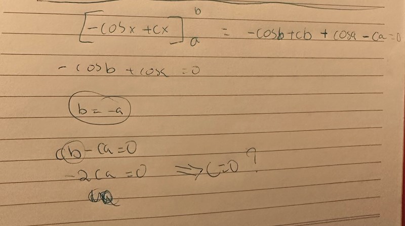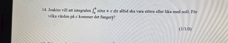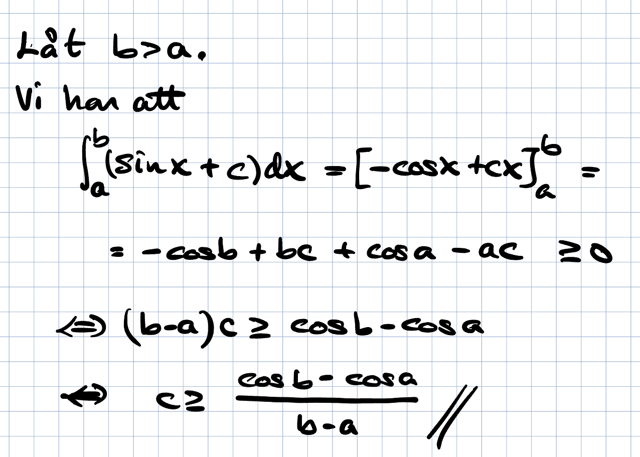 Jag tror att man ska tänka grafiskt. Oavsett värde på a och b ska man kunna göra integralen större eller lika med 0. Det innebär att det inte kan finnas någon "negativ area" över hela kurvan. Att addera en positiv konstant till en sinuskurva förflyttar hela kurvan i uppåt. Frågan är alltså hur långt behöver du flytta den för att det inte ska finnas någon area mellan kurvan och x-axeln under x-axeln.