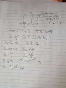 en hylsa spänd i en fjäder ges en hastighet i A och hastigheten blir 0 i B. Bestäm arbetet utfört av friktionen under förflyttningen från A till B. Jag har kommit såhär långt, och tycker mig ha fått fram ett värde på arbetet, men det är fel. Har hört att man ska använda samma metod som mig och sen integrera på något sätt, men fattar ine hur eller varför. Skulle gärna vilja ha lite hjälp med att förstå hur jag ska gå vidare härifrån eller om jag tänkt fel.