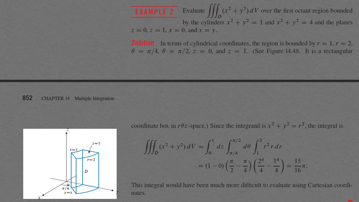 Okej. Vi har två cirklar, den ena med radie 1 och den andra med radie 2 (i xy-planet). Dessa två cirklar har en höjd begränsat av de två planen z=0 och z=1 (parallella plan med xy-planet), planet y=x (som är parallellt med z-axeln och har vinkeln med positiva x-axeln) och till sist planet x=0 som är ortogonalt med x-axeln.