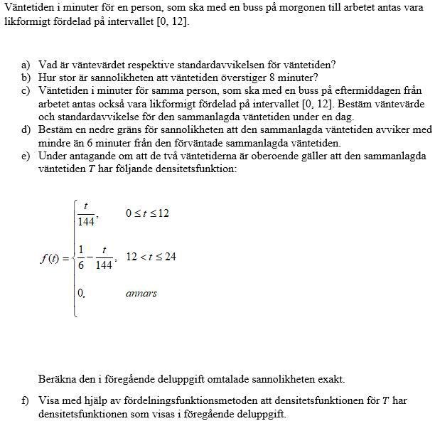 Det är störst sannolikhet att väntetiden blir 12 minuter - på samma sätt som det blir störst sannolikhet att summan blir 7 om man kastar två vanliga tärningar. Sannolikheten att du behöver vänta 24 minuter (d v s att du precis missat bussen 2 ggr) är lika stor som sannolikheten att bussen kommer direkt båda gångerna. Sannolikheten att du behöver vänta 6 minuter totalt är lika stor som sannolikheten att du behöver vänta 24-6=18 minuter. Allt detta beror på att den ursprungliga väntetiden är likformigt fördelad. Är du med på detta?