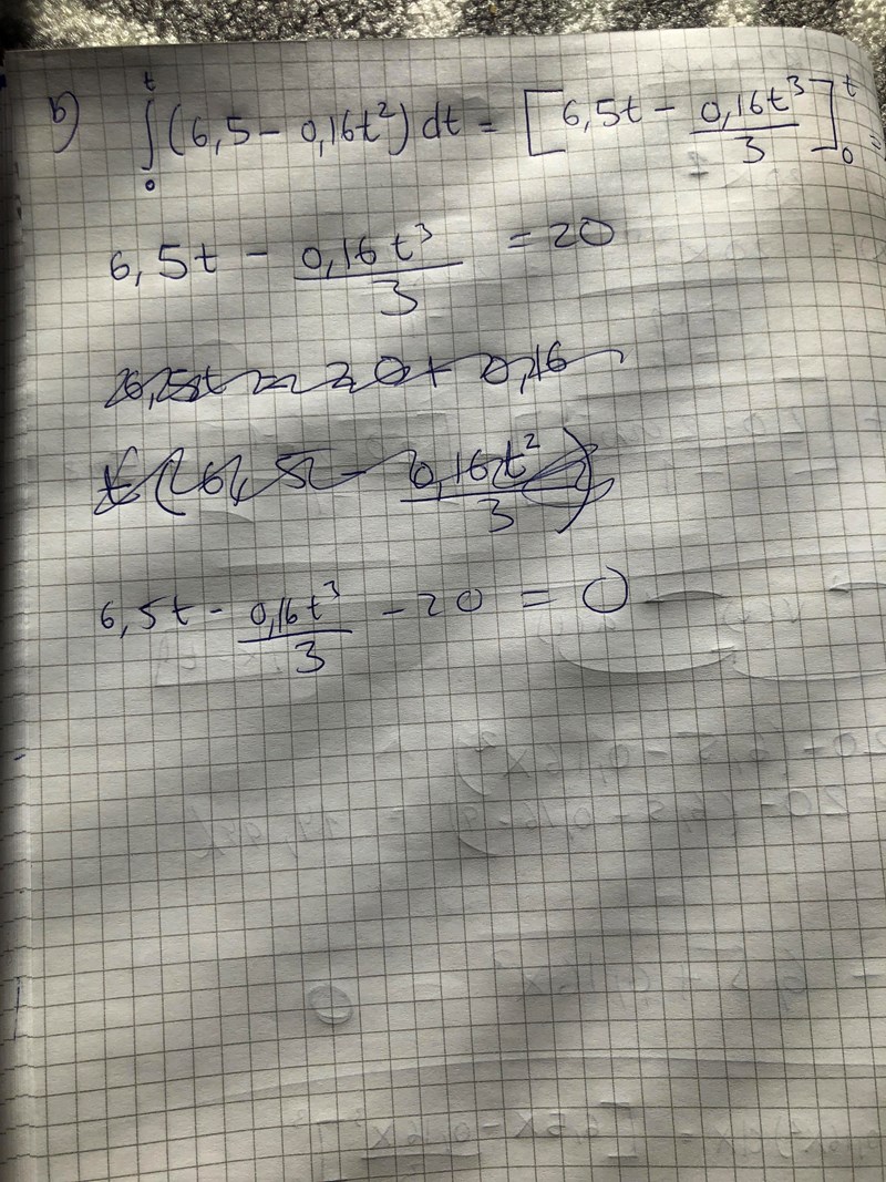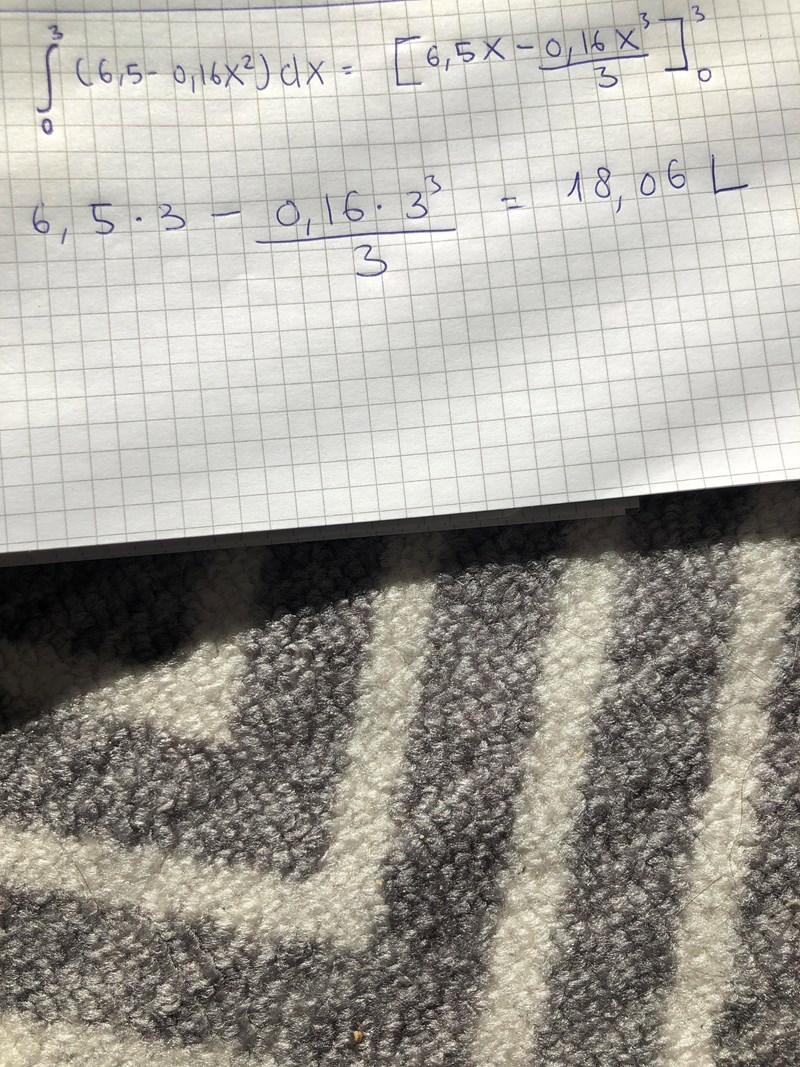 Ska jag integrera och sedan sätta in mellan x=0 och x=3? Dvs ta integralen av (6,5-0.16x^2)dx mellan x=0 och x=3? Men då får jag inte rätt svar . Integralen blir ju